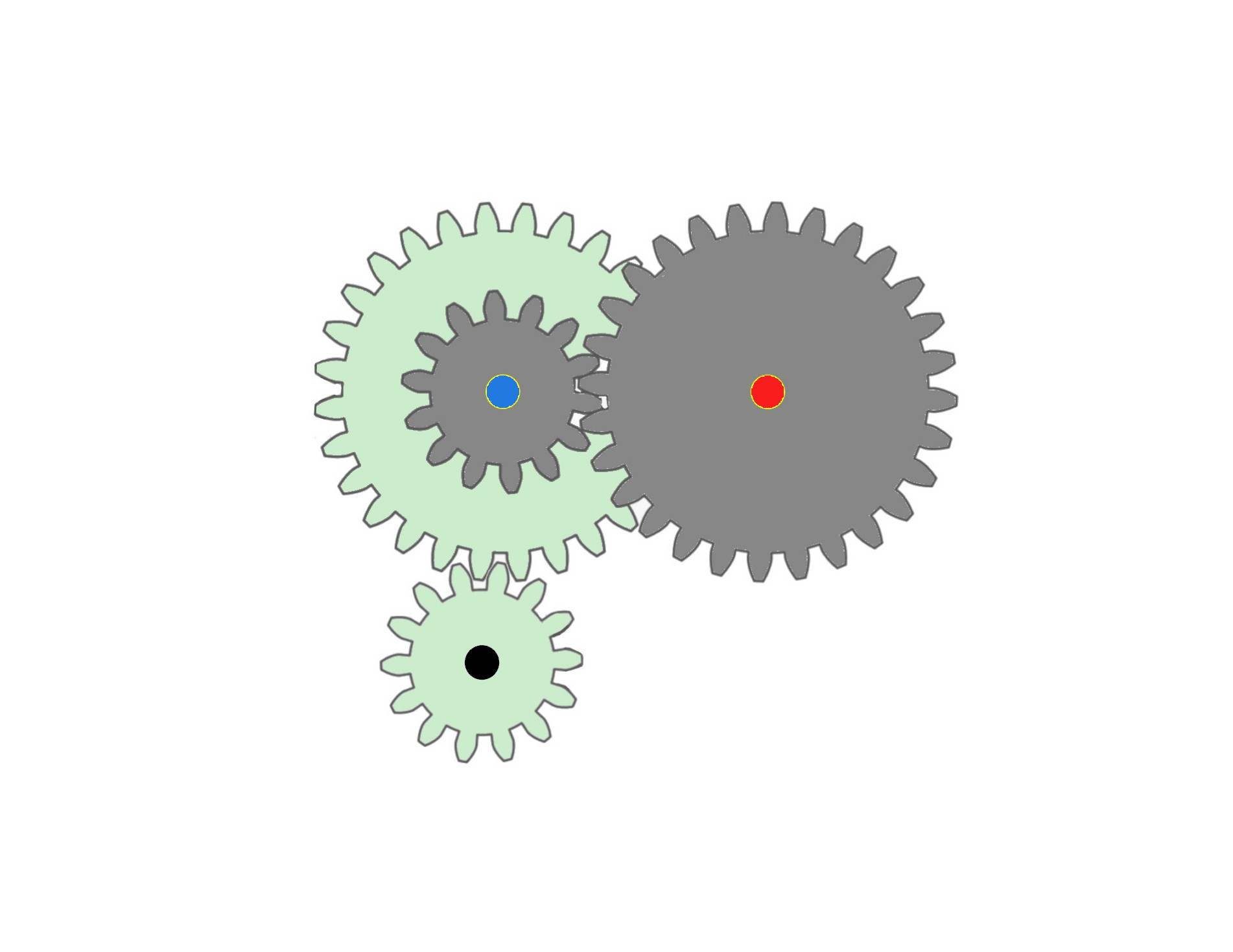 The black dotted gear turn 4 times to turn the red dotted gear 1 time.The drive gear has 14 teeth and the idler gear has 28 teeth. This makes the gear ratio 2 to 1 or 2:1. The second set of gears also has 14 teeth & 28 teeth also has a 2 to 1 ratio. The ratio is: 2:1, 2:1 or (2x2)/1 = 4/1. The motor turns 4 times to turn the red dotted gear once.