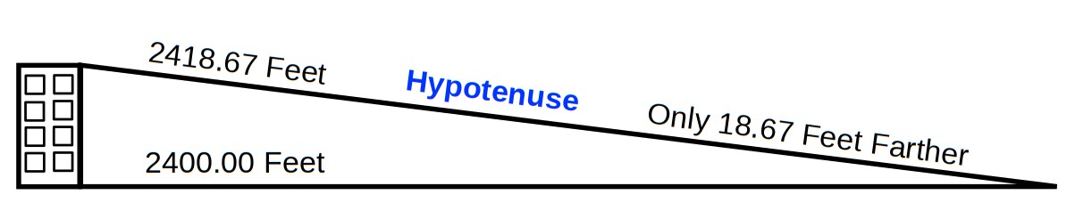 (√ A²) + (√ B²) = (√ C²) or ( 2418.6773244) feet As we can see, because, the building height is only 300 feet and the distance is 2400 feet. The hypotenuse is only about 18 feet longer than the ground distance to the bus stop